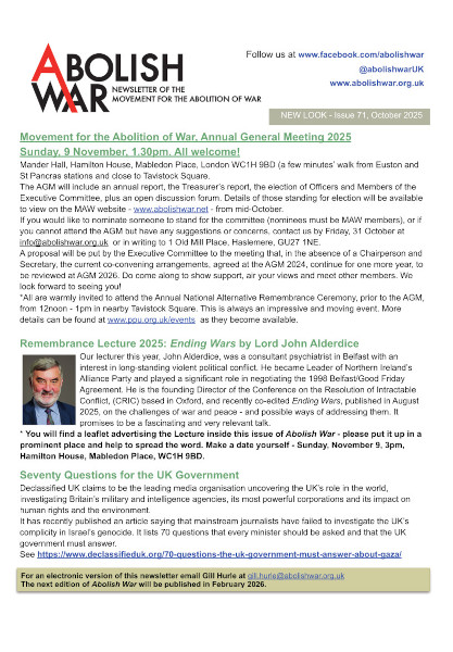 The MAW newsletter Abolish War is produced three times a year. Newsletters may be downloaded from this page as pdf files. You will need a pdf reader, such as Adobe Acrobat, to view them.