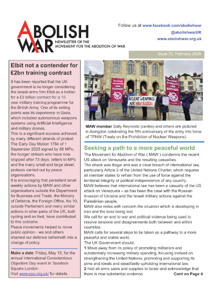 The MAW newsletter Abolish War is produced three times a year. Newsletters may be downloaded from this page as pdf files. You will need a pdf reader, such as Adobe Acrobat, to view them. The links generally display an A4 version, which is an image rather than text; the A3 version of the current newsletter has clickable links.